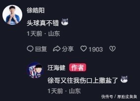 赛后,汪海健在社媒晒照并配文写说念:“说念阻且长行则将至中国队加油????????????????????????。”汪海健在上海申花的队友,同期亦然国脚的徐皓阳在探究区说说念:头球真可以!汪海健复兴:徐哥又在我伤口上撒盐了。